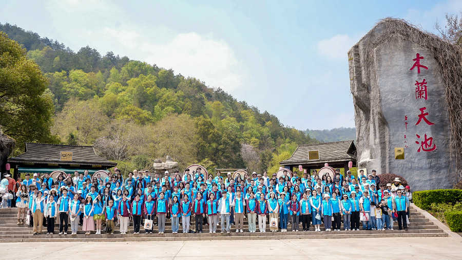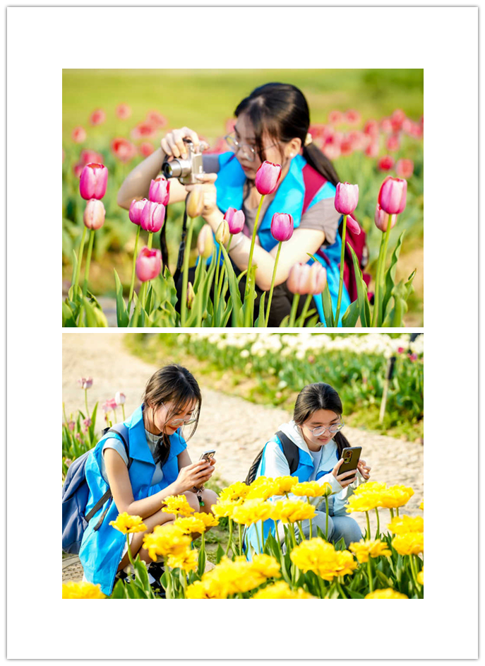 一天的旅程,學(xué)生們迎著春風(fēng)走進(jìn)天然氧吧木蘭天池,在欣賞峽谷風(fēng)光的同時(shí)觀看山水沉浸式演藝《木蘭少年志》,并在小天池、大天池等地合影留念。隨后便來(lái)到木蘭花鄉(xiāng)景區(qū),此時(shí)園中的郁金香已進(jìn)入盛花期,學(xué)生們或蹲下身子或在花道旁依次排開留下青春的倩影。當(dāng)夜幕四合,已換上漢服的學(xué)子們穿梭在木蘭不夜城古色古香的街區(qū),品小吃看表演。
